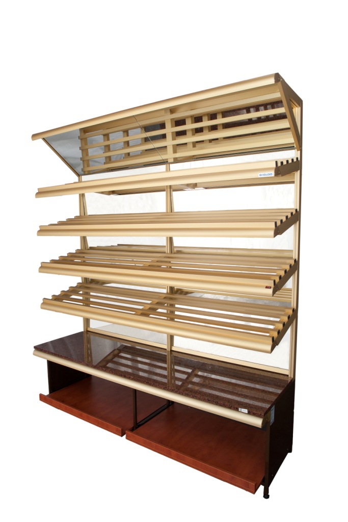 - półki ekspozycyjne z profilu aluminiowego rurkowego anodowanego na kolor srebrny lub złoty (wzornik IGLOO)