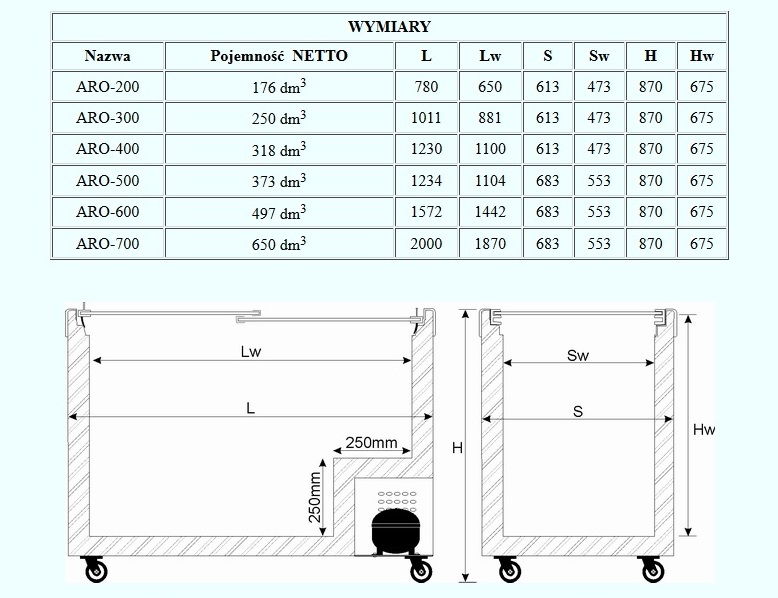 -zamrażarki wystepują w pojemnościach użytkowych od 176 do 650 litrów.